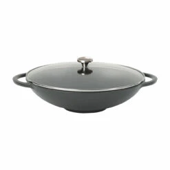 This big and heavy duty Chasseur Cast Iron Wok cooks efficiently and allows you to make the big batches of exotic and healthy foods that spice up the weekly menu. The cast iron handles are finished with enamel coating, so hoisting this piece around is as stylish as it can be. A glass lid lets you monitor the culinary action without removal, keeping the heat inside. Also for all stove tops, including induction.