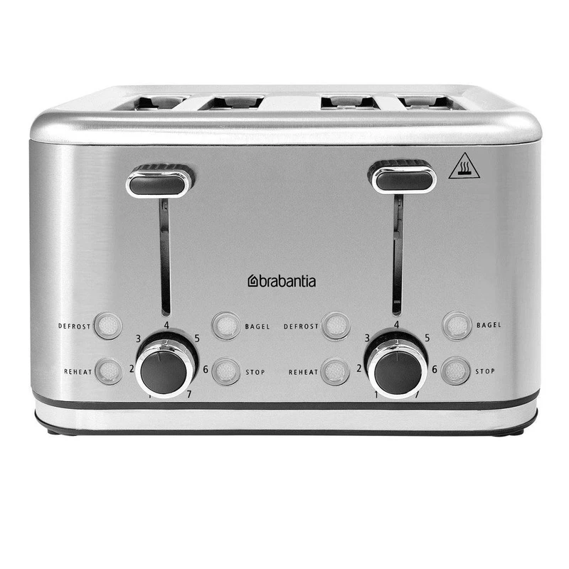Designed with 2 pop up levers the Brabantia 4-Slice Stainless Steel Toaster has 2 variable browning controls. It has a re-heat and defrosts function with 4 wide self-centering slots.