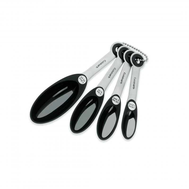 Every kitchen needs a good set of measuring spoons. Our stainless steel & nylon measuring spoons come in 1/2, 1/4, 1 teaspoon, and 1 tablespoon sizes and are kept neatly together on a storage ring. They are dishwasher-safe for easy clean-up. The Cuisinart logo stamped on the handle completes this modern and reliable set.