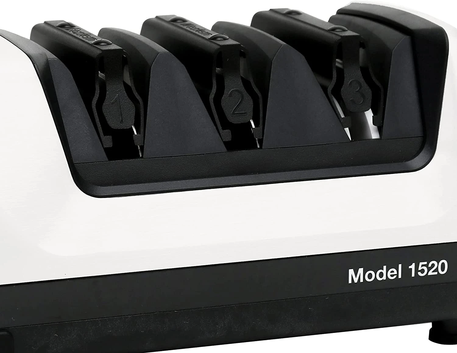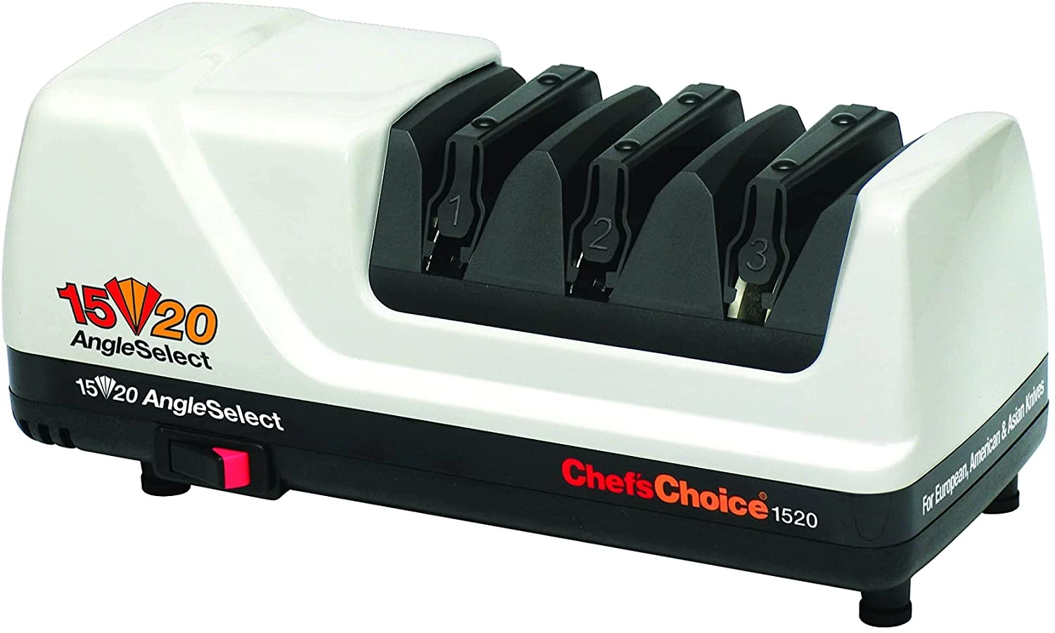 Take special care of your valuable European and Asian style knives and keep your sports, pocket, and serrated knives in top shape, ready to use, and as dependably sharp as you could wish, with this sturdy electric knife sharpener. Using 100% diamond abrasives and advanced patented flexible spring guides, the Chef Choice 1520 is easy and safe to use. Made in the USA, it is the preferred choice of professionals and home cooks who understand the difference that a finely honed edge makes to food preparation and presentation.