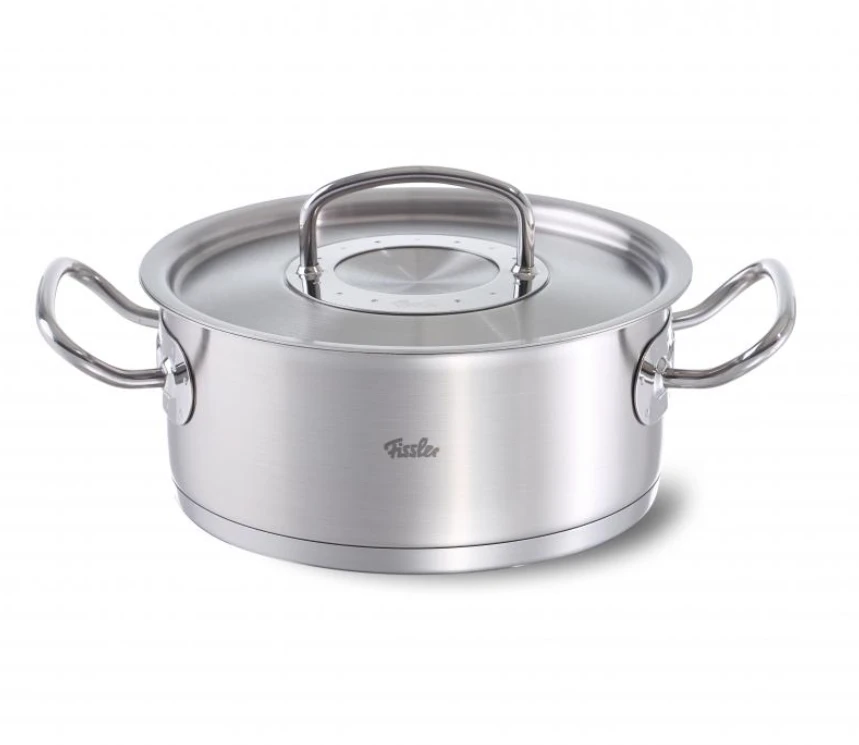 For anything that needs to cook in the pot on a low flame for quite a while after searing, this induction-compatible stainless-steel casserole is simply the best choice. It boasts relatively low walls, meaning meat and vegetables can be braised with reasonably little energy needed.