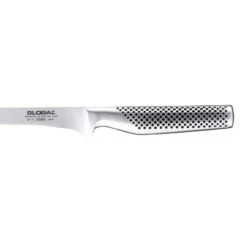 The G-32 is made from forged CROMOVA 18 stainless steel, specially developed by GLOBAL as it holds a razor-sharp and resists rust, stains, and corrosion. Ice tempered and hardened to Rockwell C56-58, each knife is carefully weighted by filling the handles with sand to achieve the optimum weight and perfect balance. Other unique features include its smooth contours and seamless construction which eliminates food and dirt traps offering the ultimate in safety and hygiene. The acute 15-degree angle cutting edge provides unsurpassed performance and superior edge retention.