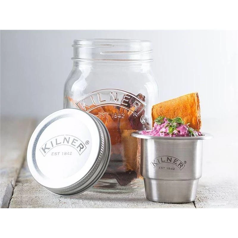 The Kilner 0.5L/17 US fl oz glass preserve jar and stainless steel pot is the healthy way to store and transport your breakfast grains or dry snacks so you can be sure that theyare kept fresh and crisp. The stainless steel cup will hold all of your liquid or wet foods separately away from the crisp dry ingredients until youare ready to mix and enjoy.