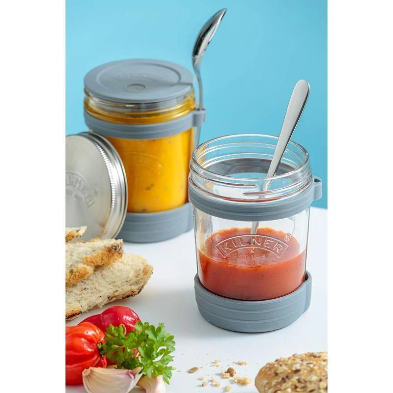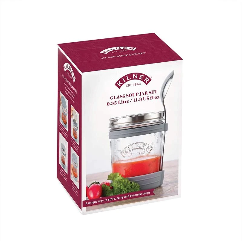 The Kilner 0.35 litre soup jar is a unique way to store, carry and consume soups whether at home or on the go. Included in the set is a Kilner 0.35 litre wide-mouth jar which comes with a silicone band to hold the winner’s stainless steel soup spoon and a silicone disc cover with an air release hole for microwave use. 1 x 0.35 litre Kilner wide mouth preserve jar 1 x Silicone Spoon holder 1 x stainless steel liner’s Branded spoon 1 x Kilner silicone disc cover for air release 1 x Silicone hand grip