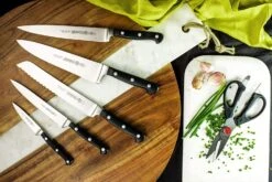 Get everything you need to chop, slice, cut and dice in this Mundial 5pc Knife Block Set. Made from fully forged, high carbon CrMo stainless steel, the full tang knives feature razor sharp edges double ground at 20 degrees.