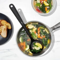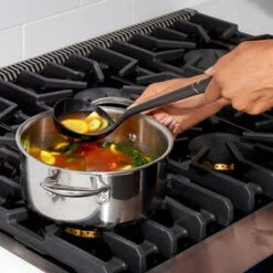 The superior design qualities of this nylon ladle allows an easy comfortable grip for all hands while serving generous sized bowls of clam chowder, potato soup or hearty lamb stew. Hang from the convenient hanging loop for easy access the stainless steel accent adds an attractive touch to this ergonomic kitchen utensil.