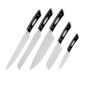 - Set includes five knives: 9cm paring knife, 12.5cm santoku knife, 20cm bread knife, 20cm carving knife, and 20cm chef’s knife