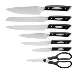 - Set includes a wooden storage block, a multipurpose kitchen shears, and six knives in the following sizes: 9cm paring knife, 14cm tomato or cheese knife, 15cm utility knife, 20cm carving knife, 20cm bread knife, and 20cm chef’s knife