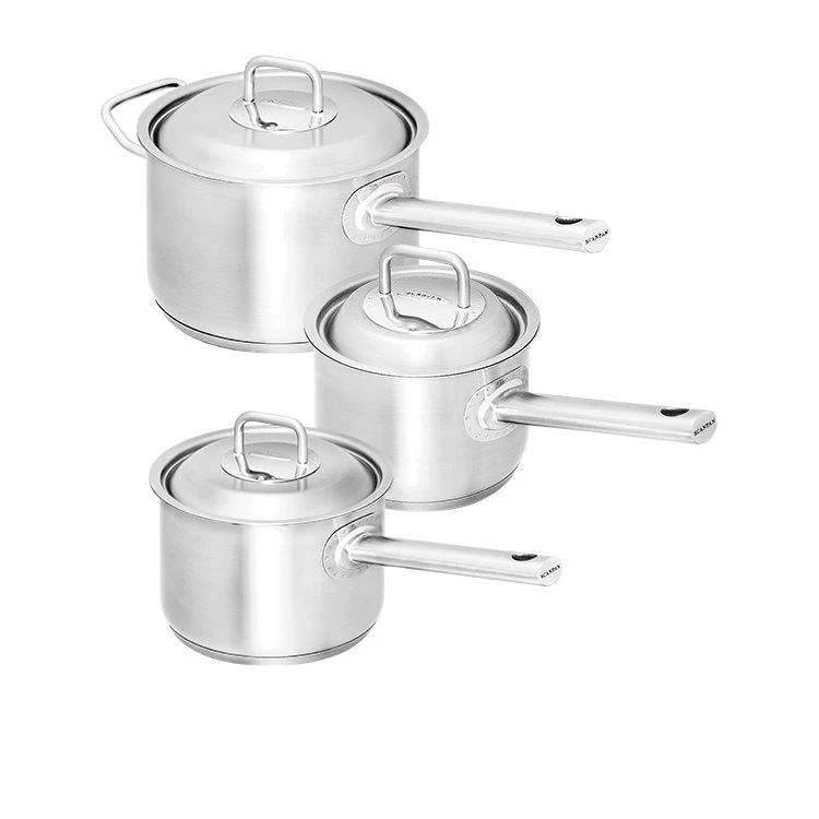 - Set includes three saucepans with lid in the following sizes: 16cm, 18cm, and 20cm