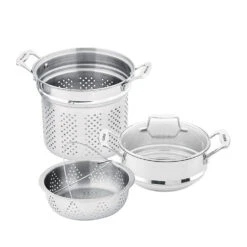 - Set includes three covered saucepans (16cm, 18cm, and 20cm), a steamer insert (that fits 16, 20, or 24cm-diameter pots), a 26cm frypan, a 24cm covered casserole, a 24cm multipot set (with stockpot, steamer basket, and pasta strainer), and a roaster with rack