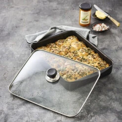 Bringing in food for a potluck party is made easier with this Scanpan Roasting Pan Lid that fits your 5L medium-sized Scanpan roaster. Take your roasted chicken or pasta bake covered with glass lid while on transport. And when you are all ready to eat, simply pop your covered pan in the oven so you and your guests can enjoy dining with warm and satisfying party food.