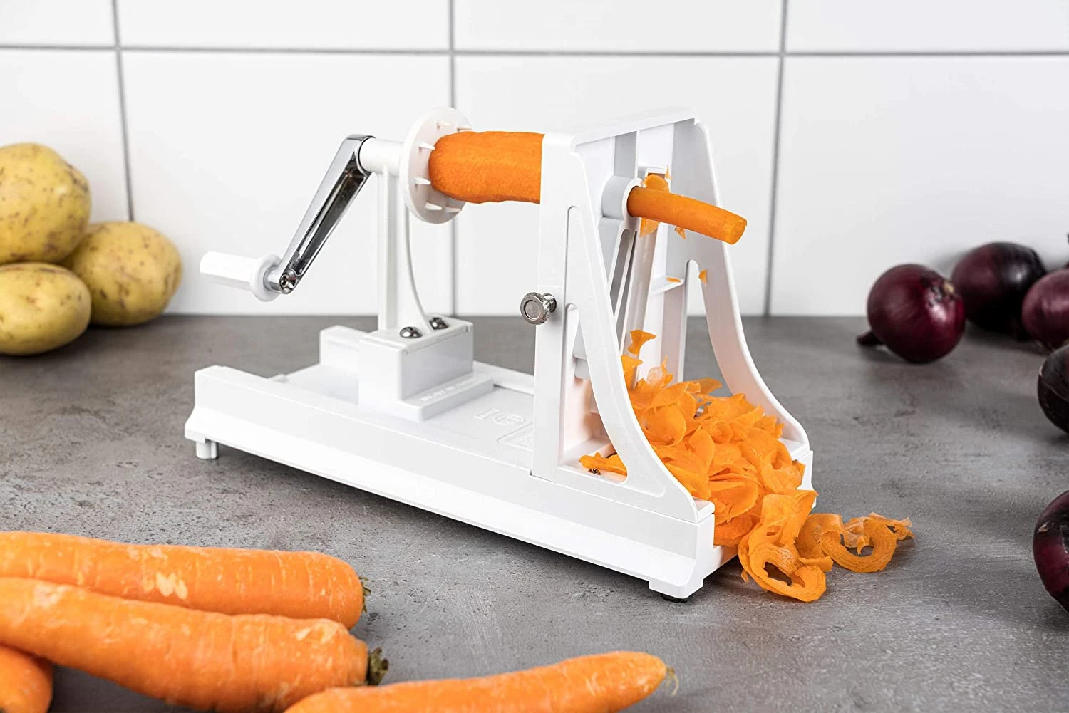 - Creates delicate spiral slices and noodles from firm-fleshed vegetables and fruits to spruce up your salads and stir-fries, creating 1 mm angel hair noodles, 2.5 mm or 4 mm flat slice shapes