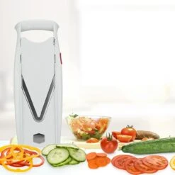The extremely sharp blades of the German-made Borner V5 PowerLine Slicer Basic Set make it easy to evenly slice any fruit or vegetable, be it hard carrots or soft tomatoes. The height of the slicing insert can be adjusted so you can make slices with four thickness levels. With its matching safety food holder, every bit of your food gets sliced while keeping your fingers away from the blade.