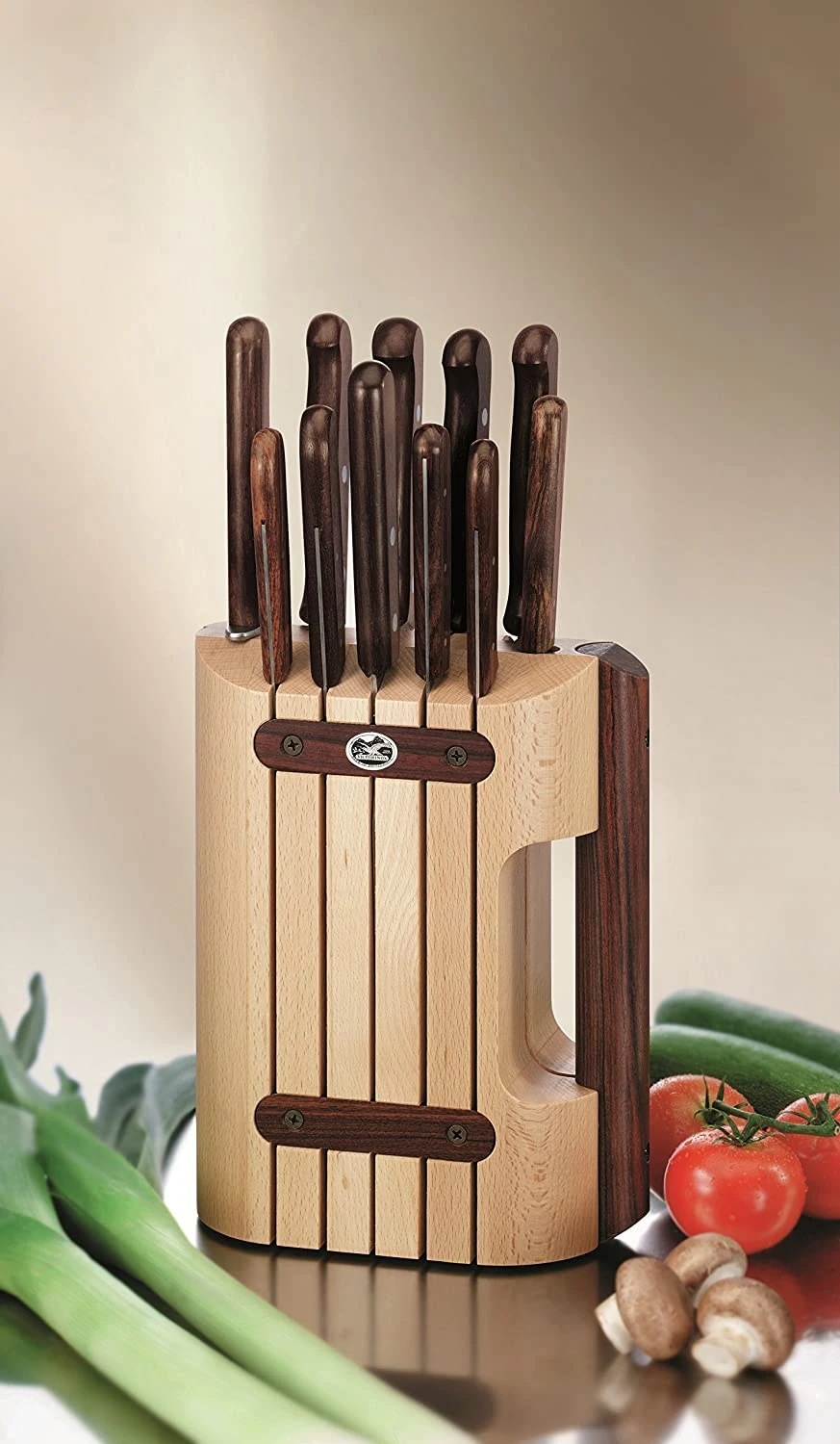 Victorinox 11-Pieces Rosewood Handle Cutlery Block set is filled with professional-quality tools and overflowing with inspiration. Each of its 11 pieces is designed to help you get the job done more efficiently and more pleasurable than you’ve ever imagined. It’s everything you need to push the envelope of your own culinary creativity just imagine the possibilities. This set contains: 1 x Potato Peeler, single edge, 1 x Wood Paring Knife, pointed tip, 10 cm, 1 x Wood Paring Knife, wavy edge, pointed tip, 10 cm, 1 x Wood Bread Knife, wavy edge, 21 cm, 1 x Wood Carving Knife, 18 cm, 1 x Wood Carving Knife, 19 cm, 1 x Wood Carving Knife, 22 cm, 1 x Wood Carving Fork, 15 cm, 1 x Wood Paring knife, pointed tip, 8 cm, 1 x Wood Paring Knife, wavy edge, pointed tip, 8 cm and 1 x Domestic Sharpening Steel, round.